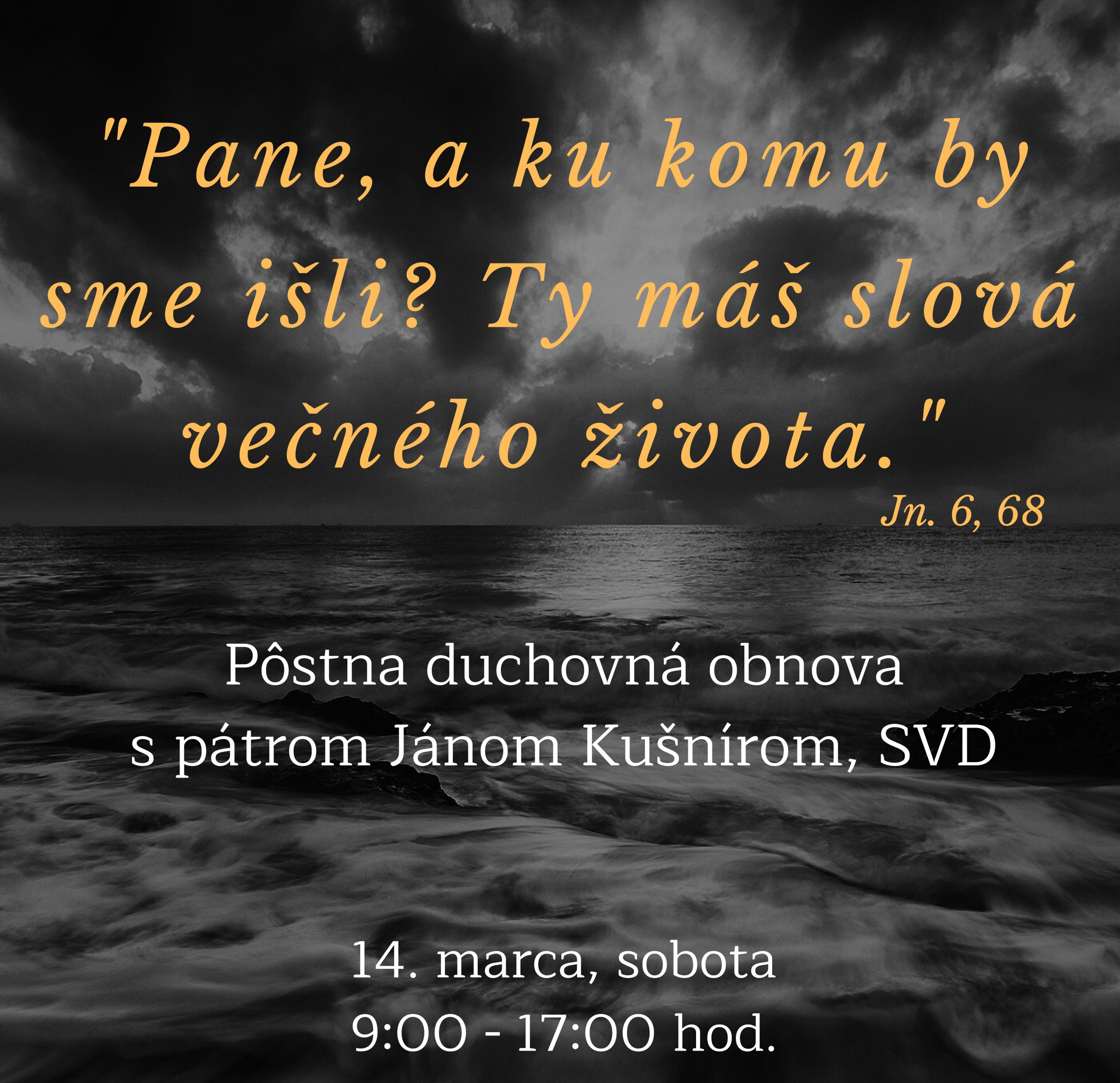 Srdečne Vás pozývame na Duchovnú obnovu, ktorú bude viesť dňa 14. marca 2020 rektor Misijného domu v Nitre, P. Ján Kušnír. Možnosť prihlásenia sa je v sakristii kostola sv. Arnolda Janssena, najneskôr do 12. marca 2020. Využite aj toto pôstne obdobie na prehĺbenie sa vo viere a vytvorme spoločenstvo, ktoré si bude navzájom povzbudením a oporou. Tešíme sa na Vás!
